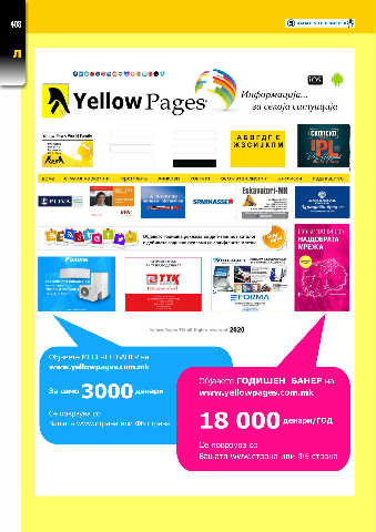 408 L Објавете МЕСЕЧЕН БАНЕР на www.yellowpages.com.mk Објавете ГОДИШЕН БАНЕР на 3000 www.yellowpages.com.mk За само денари Се поврзува со Вашата www.страна или ФБ страна 18 000 денари/ГОД Се поврзува со Вашата www.страна или ФБ страна