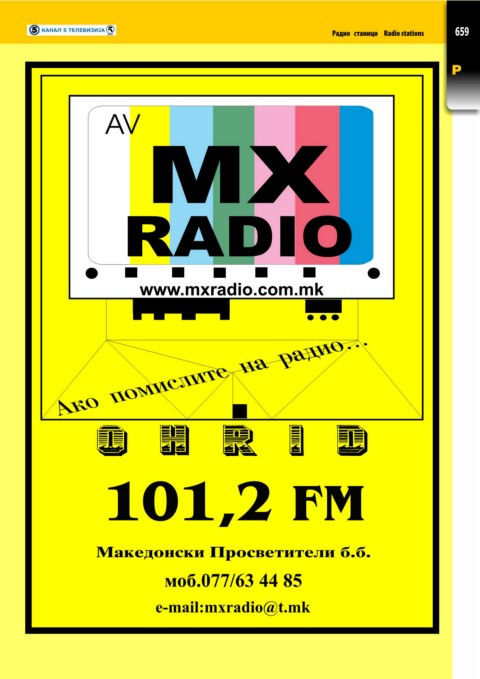 Радио станици Radio stations 659 Ð мх радио mx radio 101,2 FM моб.077/63 44 85 e-mail:mxradio@t.mk
